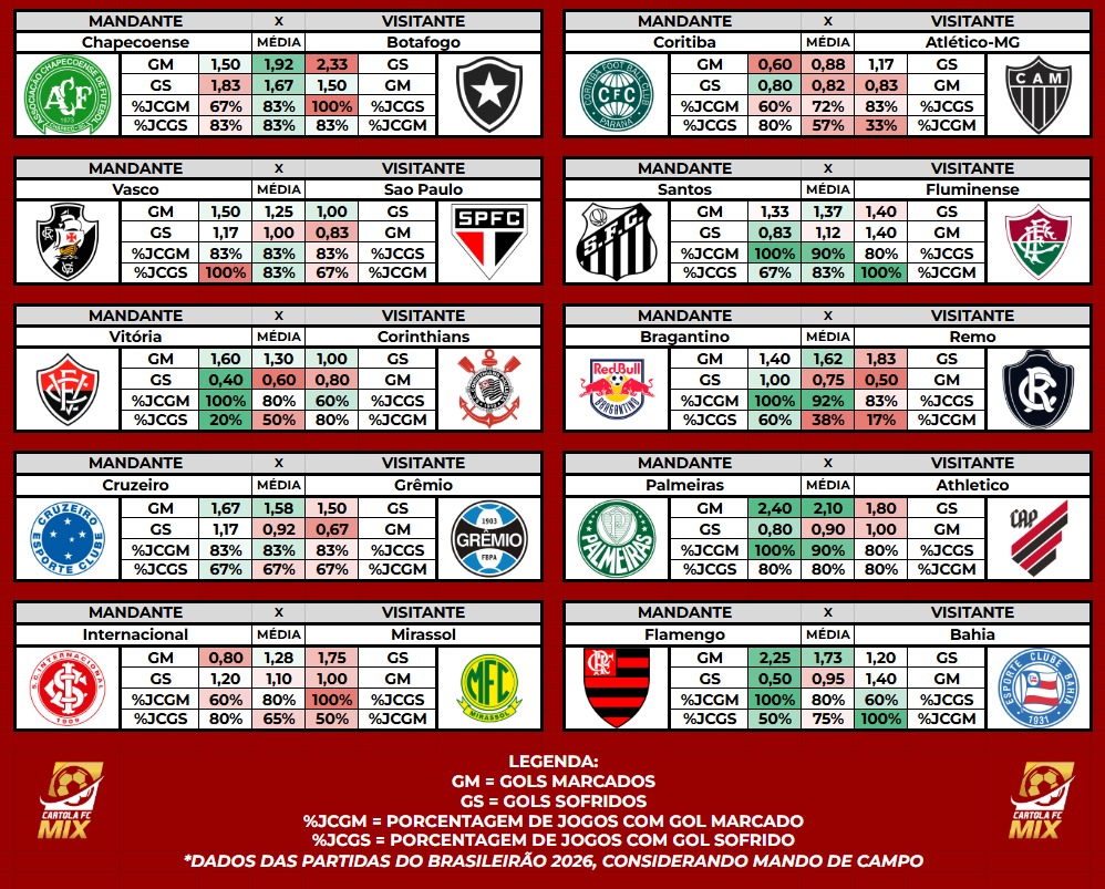 Conforme já informado, a partir da 5ª rodada os dados informados e analisados são do Brasileirão 2026.