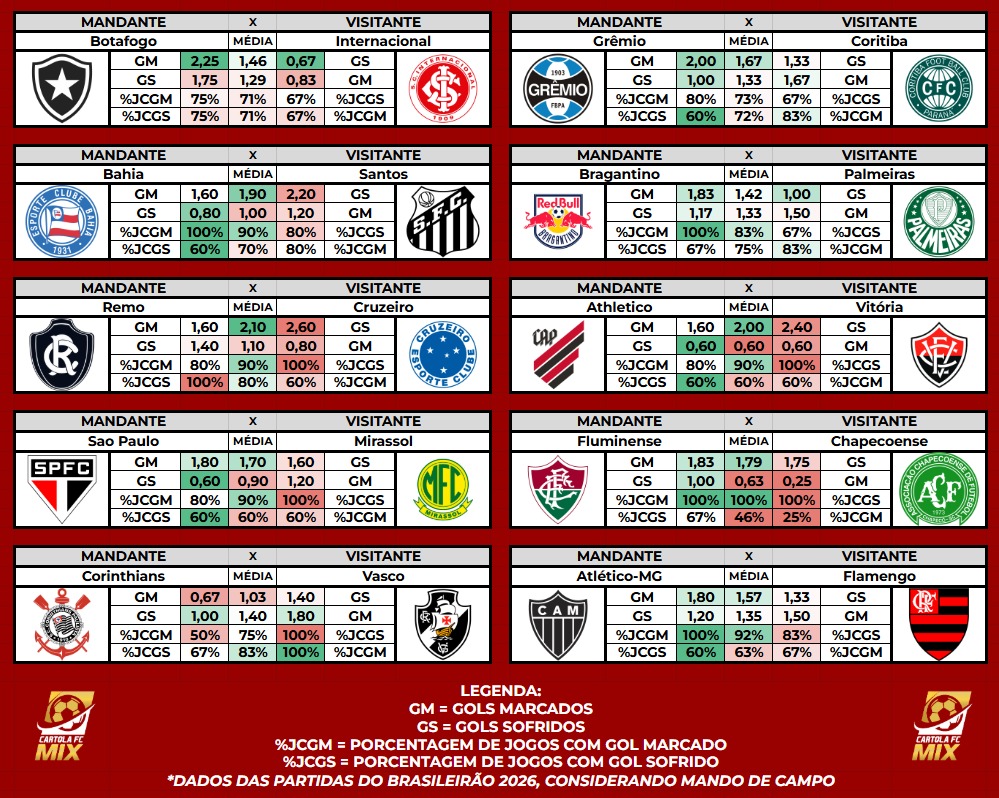 Conforme já informado, a partir da 5ª rodada os dados informados e analisados são do Brasileirão 2026.